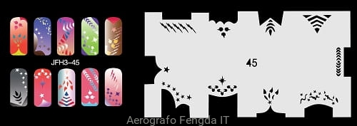 Disegno (modello) per le unghie Fengda (nail stencil) è un ottimo aiuto per l'arte aerografo unghie, o nail design. Il modello è lavabile e riutilizzabile. Il modello è a forma di cerchio e contiene un gran numero di diversi disegni, che possono essere combinati per creare un aspetto unico di unghie.
