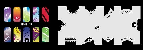 Disegno (modello) per le unghie Fengda (nail stencil) è un ottimo aiuto per l'arte aerografo unghie, o nail design. Il modello è lavabile e riutilizzabile. Il modello è a forma di cerchio e contiene un gran numero di diversi disegni, che possono essere combinati per creare un aspetto unico di unghie.