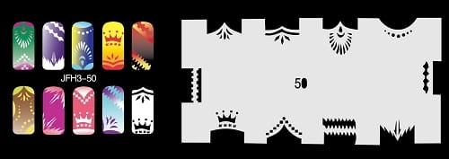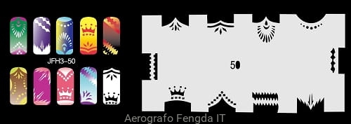 Disegno (modello) per le unghie Fengda (nail stencil) è un ottimo aiuto per l'arte aerografo unghie, o nail design. Il modello è lavabile e riutilizzabile. Il modello è a forma di cerchio e contiene un gran numero di diversi disegni, che possono essere combinati per creare un aspetto unico di unghie.