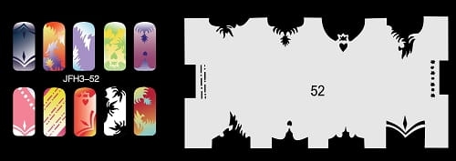 Disegno (modello) per le unghie Fengda (nail stencil) è un ottimo aiuto per l'arte aerografo unghie, o nail design. Il modello è lavabile e riutilizzabile. Il modello è a forma di cerchio e contiene un gran numero di diversi disegni, che possono essere combinati per creare un aspetto unico di unghie.