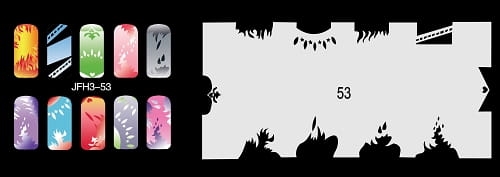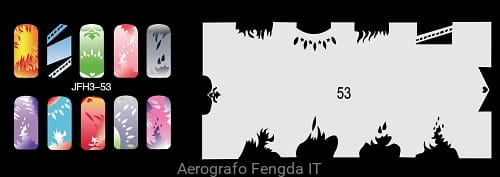 Disegno (modello) per le unghie Fengda (nail stencil) è un ottimo aiuto per l'arte aerografo unghie, o nail design. Il modello è lavabile e riutilizzabile. Il modello è a forma di cerchio e contiene un gran numero di diversi disegni, che possono essere combinati per creare un aspetto unico di unghie.