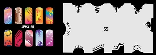Disegno (modello) per le unghie Fengda (nail stencil) è un ottimo aiuto per l'arte aerografo unghie, o nail design. Il modello è lavabile e riutilizzabile. Il modello è a forma di cerchio e contiene un gran numero di diversi disegni, che possono essere combinati per creare un aspetto unico di unghie.