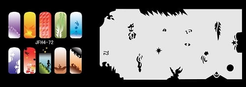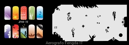Disegno (modello) per le unghie Fengda (nail stencil) è un ottimo aiuto per l'arte aerografo unghie, o nail design. Il modello è lavabile e riutilizzabile. Il modello è a forma di cerchio e contiene un gran numero di diversi disegni, che possono essere combinati per creare un aspetto unico di unghie.