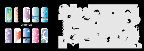 Disegno (modello) per le unghie Fengda (nail stencil) è un ottimo aiuto per l'arte aerografo unghie, o nail design. Il modello è lavabile e riutilizzabile. Il modello è a forma di cerchio e contiene un gran numero di diversi disegni, che possono essere combinati per creare un aspetto unico di unghie.
