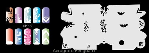Disegno (modello) per le unghie Fengda (nail stencil) è un ottimo aiuto per l'arte aerografo unghie, o nail design. Il modello è lavabile e riutilizzabile. Il modello è a forma di cerchio e contiene un gran numero di diversi disegni, che possono essere combinati per creare un aspetto unico di unghie.