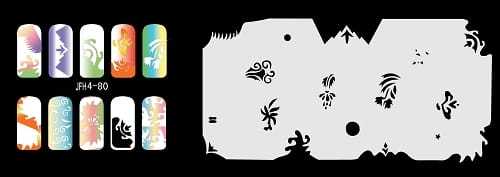Disegno (modello) per le unghie Fengda (nail stencil) è un ottimo aiuto per l'arte aerografo unghie, o nail design. Il modello è lavabile e riutilizzabile. Il modello è a forma di cerchio e contiene un gran numero di diversi disegni, che possono essere combinati per creare un aspetto unico di unghie.