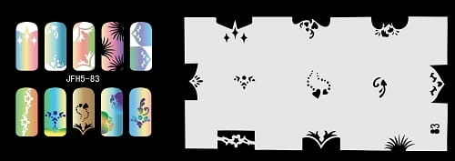 Disegno (modello) per le unghie Fengda (nail stencil) è un ottimo aiuto per l'arte aerografo unghie, o nail design. Il modello è lavabile e riutilizzabile. Il modello è a forma di cerchio e contiene un gran numero di diversi disegni, che possono essere combinati per creare un aspetto unico di unghie.