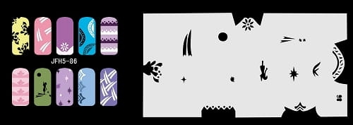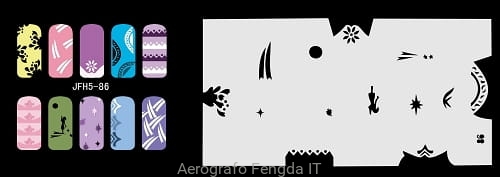 Disegno (modello) per le unghie Fengda (nail stencil) è un ottimo aiuto per l'arte aerografo unghie, o nail design. Il modello è lavabile e riutilizzabile. Il modello è a forma di cerchio e contiene un gran numero di diversi disegni, che possono essere combinati per creare un aspetto unico di unghie.