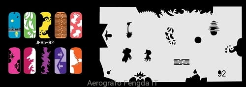 Disegno (modello) per le unghie Fengda (nail stencil) è un ottimo aiuto per l'arte aerografo unghie, o nail design. Il modello è lavabile e riutilizzabile. Il modello è a forma di cerchio e contiene un gran numero di diversi disegni, che possono essere combinati per creare un aspetto unico di unghie.