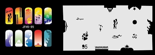 Disegno (modello) per le unghie Fengda (nail stencil) è un ottimo aiuto per l'arte aerografo unghie, o nail design. Il modello è lavabile e riutilizzabile. Il modello è a forma di cerchio e contiene un gran numero di diversi disegni, che possono essere combinati per creare un aspetto unico di unghie.