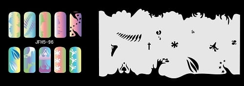 Disegno (modello) per le unghie Fengda (nail stencil) è un ottimo aiuto per l'arte aerografo unghie, o nail design. Il modello è lavabile e riutilizzabile. Il modello è a forma di cerchio e contiene un gran numero di diversi disegni, che possono essere combinati per creare un aspetto unico di unghie.