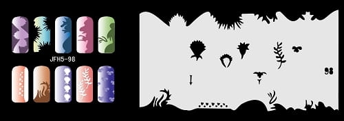 Disegno (modello) per le unghie Fengda (nail stencil) è un ottimo aiuto per l'arte aerografo unghie, o nail design. Il modello è lavabile e riutilizzabile. Il modello è a forma di cerchio e contiene un gran numero di diversi disegni, che possono essere combinati per creare un aspetto unico di unghie.