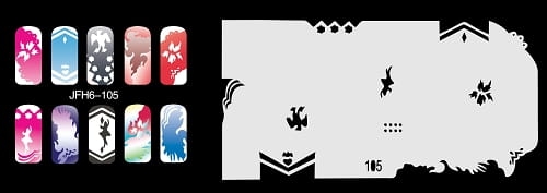 Disegno (modello) per le unghie Fengda (nail stencil) è un ottimo aiuto per l'arte aerografo unghie, o nail design. Il modello è lavabile e riutilizzabile. Il modello è a forma di cerchio e contiene un gran numero di diversi disegni, che possono essere combinati per creare un aspetto unico di unghie.
