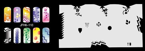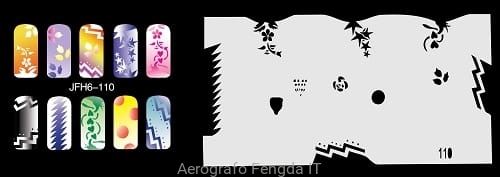 Disegno (modello) per le unghie Fengda (nail stencil) è un ottimo aiuto per l'arte aerografo unghie, o nail design. Il modello è lavabile e riutilizzabile. Il modello è a forma di cerchio e contiene un gran numero di diversi disegni, che possono essere combinati per creare un aspetto unico di unghie.