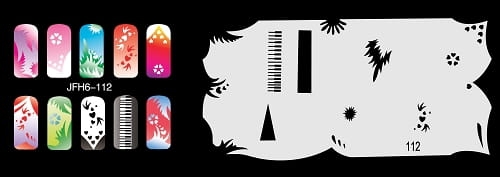 Disegno (modello) per le unghie Fengda (nail stencil) è un ottimo aiuto per l'arte aerografo unghie, o nail design. Il modello è lavabile e riutilizzabile. Il modello è a forma di cerchio e contiene un gran numero di diversi disegni, che possono essere combinati per creare un aspetto unico di unghie.