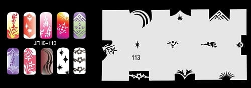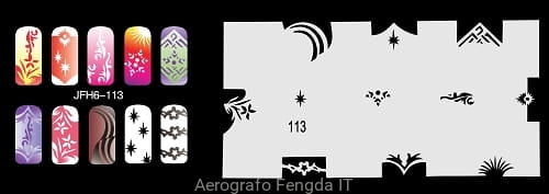 Disegno (modello) per le unghie Fengda (nail stencil) è un ottimo aiuto per l'arte aerografo unghie, o nail design. Il modello è lavabile e riutilizzabile. Il modello è a forma di cerchio e contiene un gran numero di diversi disegni, che possono essere combinati per creare un aspetto unico di unghie.