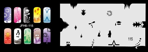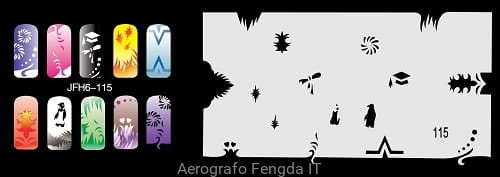 Disegno (modello) per le unghie Fengda (nail stencil) è un ottimo aiuto per l'arte aerografo unghie, o nail design. Il modello è lavabile e riutilizzabile. Il modello è a forma di cerchio e contiene un gran numero di diversi disegni, che possono essere combinati per creare un aspetto unico di unghie.