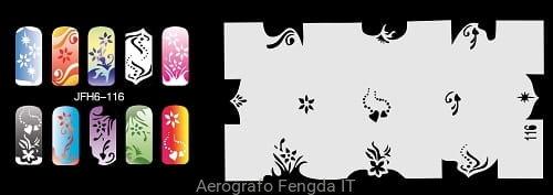 Disegno (modello) per le unghie Fengda (nail stencil) è un ottimo aiuto per l'arte aerografo unghie, o nail design. Il modello è lavabile e riutilizzabile. Il modello è a forma di cerchio e contiene un gran numero di diversi disegni, che possono essere combinati per creare un aspetto unico di unghie.