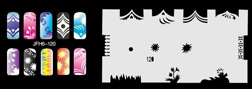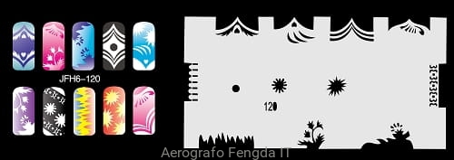 Disegno (modello) per le unghie Fengda (nail stencil) è un ottimo aiuto per l'arte aerografo unghie, o nail design. Il modello è lavabile e riutilizzabile. Il modello è a forma di cerchio e contiene un gran numero di diversi disegni, che possono essere combinati per creare un aspetto unico di unghie.