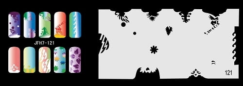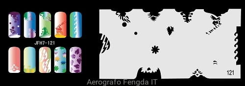 Disegno (modello) per le unghie Fengda (nail stencil) è un ottimo aiuto per l'arte aerografo unghie, o nail design. Il modello è lavabile e riutilizzabile. Il modello è a forma di cerchio e contiene un gran numero di diversi disegni, che possono essere combinati per creare un aspetto unico di unghie.