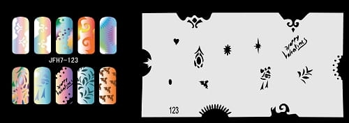 Disegno (modello) per le unghie Fengda (nail stencil) è un ottimo aiuto per l'arte aerografo unghie, o nail design. Il modello è lavabile e riutilizzabile. Il modello è a forma di cerchio e contiene un gran numero di diversi disegni, che possono essere combinati per creare un aspetto unico di unghie.