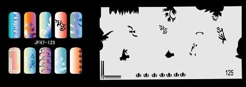 Disegno (modello) per le unghie Fengda (nail stencil) è un ottimo aiuto per l'arte aerografo unghie, o nail design. Il modello è lavabile e riutilizzabile. Il modello è a forma di cerchio e contiene un gran numero di diversi disegni, che possono essere combinati per creare un aspetto unico di unghie.