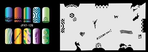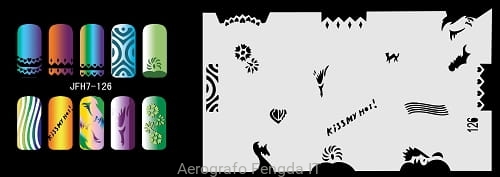 Disegno (modello) per le unghie Fengda (nail stencil) è un ottimo aiuto per l'arte aerografo unghie, o nail design. Il modello è lavabile e riutilizzabile. Il modello è a forma di cerchio e contiene un gran numero di diversi disegni, che possono essere combinati per creare un aspetto unico di unghie.