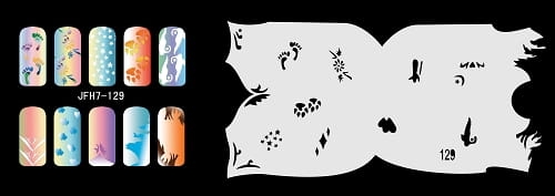 Disegno (modello) per le unghie Fengda (nail stencil) è un ottimo aiuto per l'arte aerografo unghie, o nail design. Il modello è lavabile e riutilizzabile. Il modello è a forma di cerchio e contiene un gran numero di diversi disegni, che possono essere combinati per creare un aspetto unico di unghie.