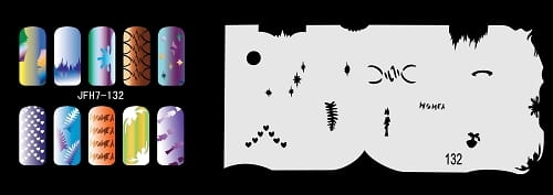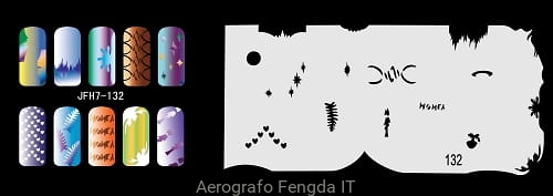 Disegno (modello) per le unghie Fengda (nail stencil) è un ottimo aiuto per l'arte aerografo unghie, o nail design. Il modello è lavabile e riutilizzabile. Il modello è a forma di cerchio e contiene un gran numero di diversi disegni, che possono essere combinati per creare un aspetto unico di unghie.