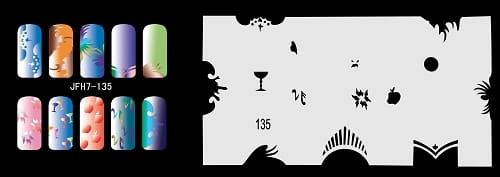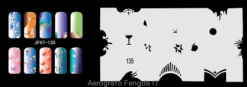Disegno (modello) per le unghie Fengda (nail stencil) è un ottimo aiuto per l'arte aerografo unghie, o nail design. Il modello è lavabile e riutilizzabile. Il modello è a forma di cerchio e contiene un gran numero di diversi disegni, che possono essere combinati per creare un aspetto unico di unghie.