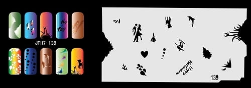 Disegno (modello) per le unghie Fengda (nail stencil) è un ottimo aiuto per l'arte aerografo unghie, o nail design. Il modello è lavabile e riutilizzabile. Il modello è a forma di cerchio e contiene un gran numero di diversi disegni, che possono essere combinati per creare un aspetto unico di unghie.