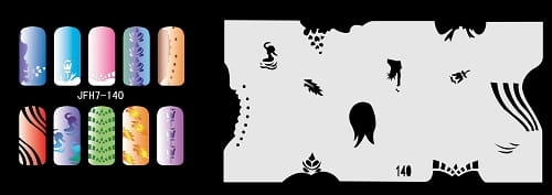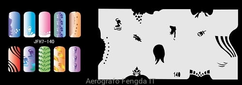 Disegno (modello) per le unghie Fengda (nail stencil) è un ottimo aiuto per l'arte aerografo unghie, o nail design. Il modello è lavabile e riutilizzabile. Il modello è a forma di cerchio e contiene un gran numero di diversi disegni, che possono essere combinati per creare un aspetto unico di unghie.