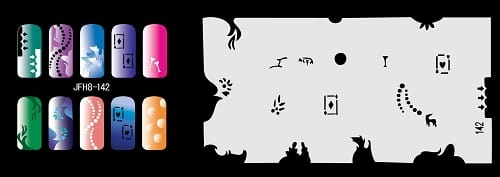 Disegno (modello) per le unghie Fengda (nail stencil) è un ottimo aiuto per l'arte aerografo unghie, o nail design. Il modello è lavabile e riutilizzabile. Il modello è a forma di cerchio e contiene un gran numero di diversi disegni, che possono essere combinati per creare un aspetto unico di unghie.