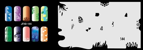 Disegno (modello) per le unghie Fengda (nail stencil) è un ottimo aiuto per l'arte aerografo unghie, o nail design. Il modello è lavabile e riutilizzabile. Il modello è a forma di cerchio e contiene un gran numero di diversi disegni, che possono essere combinati per creare un aspetto unico di unghie.
