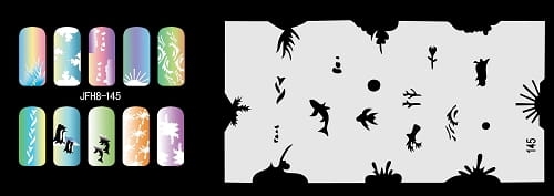 Disegno (modello) per le unghie Fengda (nail stencil) è un ottimo aiuto per l'arte aerografo unghie, o nail design. Il modello è lavabile e riutilizzabile. Il modello è a forma di cerchio e contiene un gran numero di diversi disegni, che possono essere combinati per creare un aspetto unico di unghie.