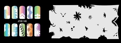 Disegno (modello) per le unghie Fengda (nail stencil) è un ottimo aiuto per l'arte aerografo unghie, o nail design. Il modello è lavabile e riutilizzabile. Il modello è a forma di cerchio e contiene un gran numero di diversi disegni, che possono essere combinati per creare un aspetto unico di unghie.