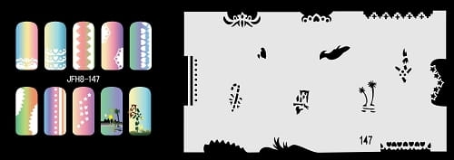 Disegno (modello) per le unghie Fengda (nail stencil) è un ottimo aiuto per l'arte aerografo unghie, o nail design. Il modello è lavabile e riutilizzabile. Il modello è a forma di cerchio e contiene un gran numero di diversi disegni, che possono essere combinati per creare un aspetto unico di unghie.