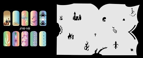 Disegno (modello) per le unghie Fengda (nail stencil) è un ottimo aiuto per l'arte aerografo unghie, o nail design. Il modello è lavabile e riutilizzabile. Il modello è a forma di cerchio e contiene un gran numero di diversi disegni, che possono essere combinati per creare un aspetto unico di unghie.