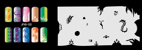 Disegno (modello) per le unghie Fengda (nail stencil) è un ottimo aiuto per l'arte aerografo unghie, o nail design. Il modello è lavabile e riutilizzabile. Il modello è a forma di cerchio e contiene un gran numero di diversi disegni, che possono essere combinati per creare un aspetto unico di unghie.