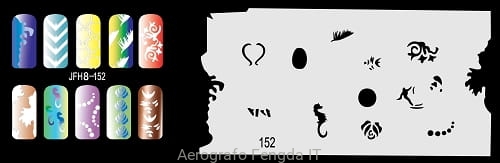 Disegno (modello) per le unghie Fengda (nail stencil) è un ottimo aiuto per l'arte aerografo unghie, o nail design. Il modello è lavabile e riutilizzabile. Il modello è a forma di cerchio e contiene un gran numero di diversi disegni, che possono essere combinati per creare un aspetto unico di unghie.