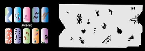 Disegno (modello) per le unghie Fengda (nail stencil) è un ottimo aiuto per l'arte aerografo unghie, o nail design. Il modello è lavabile e riutilizzabile. Il modello è a forma di cerchio e contiene un gran numero di diversi disegni, che possono essere combinati per creare un aspetto unico di unghie.