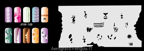 Disegno (modello) per le unghie Fengda (nail stencil) è un ottimo aiuto per l'arte aerografo unghie, o nail design. Il modello è lavabile e riutilizzabile. Il modello è a forma di cerchio e contiene un gran numero di diversi disegni, che possono essere combinati per creare un aspetto unico di unghie.