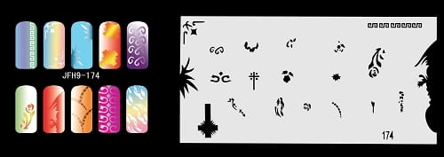 Disegno (modello) per le unghie Fengda (nail stencil) è un ottimo aiuto per l'arte aerografo unghie, o nail design. Il modello è lavabile e riutilizzabile. Il modello è a forma di cerchio e contiene un gran numero di diversi disegni, che possono essere combinati per creare un aspetto unico di unghie.