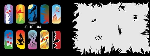 Disegno (modello) per le unghie Fengda (nail stencil) è un ottimo aiuto per l'arte aerografo unghie, o nail design. Il modello è lavabile e riutilizzabile. Il modello è a forma di cerchio e contiene un gran numero di diversi disegni, che possono essere combinati per creare un aspetto unico di unghie.