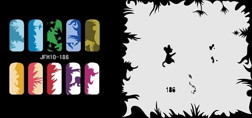 Disegno (modello) per le unghie Fengda (nail stencil) è un ottimo aiuto per l'arte aerografo unghie, o nail design. Il modello è lavabile e riutilizzabile. Il modello è a forma di cerchio e contiene un gran numero di diversi disegni, che possono essere combinati per creare un aspetto unico di unghie.