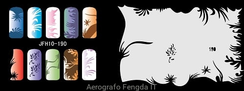 Disegno (modello) per le unghie Fengda (nail stencil) è un ottimo aiuto per l'arte aerografo unghie, o nail design. Il modello è lavabile e riutilizzabile. Il modello è a forma di cerchio e contiene un gran numero di diversi disegni, che possono essere combinati per creare un aspetto unico di unghie.