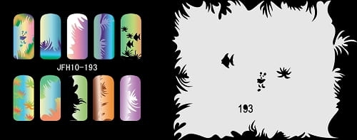 Disegno (modello) per le unghie Fengda (nail stencil) è un ottimo aiuto per l'arte aerografo unghie, o nail design. Il modello è lavabile e riutilizzabile. Il modello è a forma di cerchio e contiene un gran numero di diversi disegni, che possono essere combinati per creare un aspetto unico di unghie.