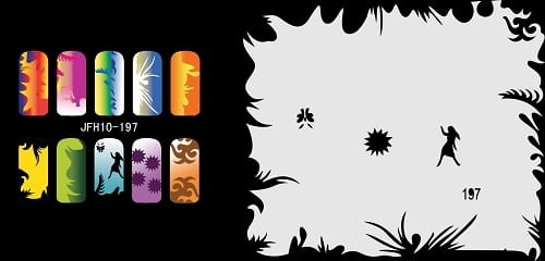 Disegno (modello) per le unghie Fengda (nail stencil) è un ottimo aiuto per l'arte aerografo unghie, o nail design. Il modello è lavabile e riutilizzabile. Il modello è a forma di cerchio e contiene un gran numero di diversi disegni, che possono essere combinati per creare un aspetto unico di unghie.