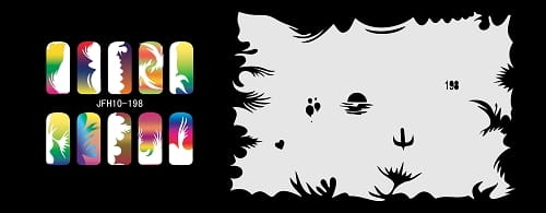 Disegno (modello) per le unghie Fengda (nail stencil) è un ottimo aiuto per l'arte aerografo unghie, o nail design. Il modello è lavabile e riutilizzabile. Il modello è a forma di cerchio e contiene un gran numero di diversi disegni, che possono essere combinati per creare un aspetto unico di unghie.