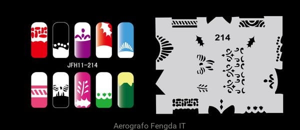 Disegno (modello) per le unghie Fengda (nail stencil) è un ottimo aiuto per l'arte aerografo unghie, o nail design. Il modello è lavabile e riutilizzabile. Il modello è a forma di cerchio e contiene un gran numero di diversi disegni, che possono essere combinati per creare un aspetto unico di unghie.
